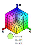 RGB色彩空间中,一个图像的采样点由三个数字组成,代表三种颜色分量的值。上图为一个简单的示例图,其中的绿色小圆点各个分量的值对应RGB坐标系里的坐标点在各个轴的投影。