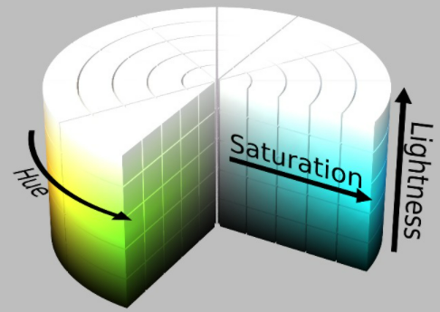 HLS 的三个分量是hue(色相)、saturation(饱和度)、lightness(亮度)。和HSV类似,区别是亮度Lightness和明度Value。