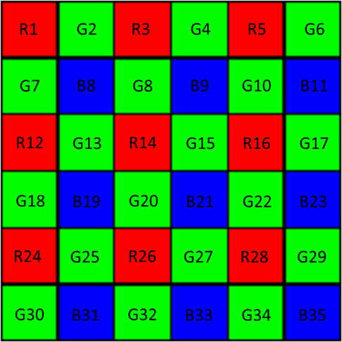 需要注意的是这种方式实际Sensor的一个像素只能记录一种颜色,在CFA出现之前,单个像素上摆放的是R、G、B三个滤光片,单个像素实际上能得到的全部三通道的值。CFA出现之后,使用CFA的sensor,单个像素只能获得一种颜色值,然后再通过插值的方法恢复出其它两个分量的值。这样对于滤光片的制作的难度上要求就降低了,特别是当单个像素面积越变越小的时候。