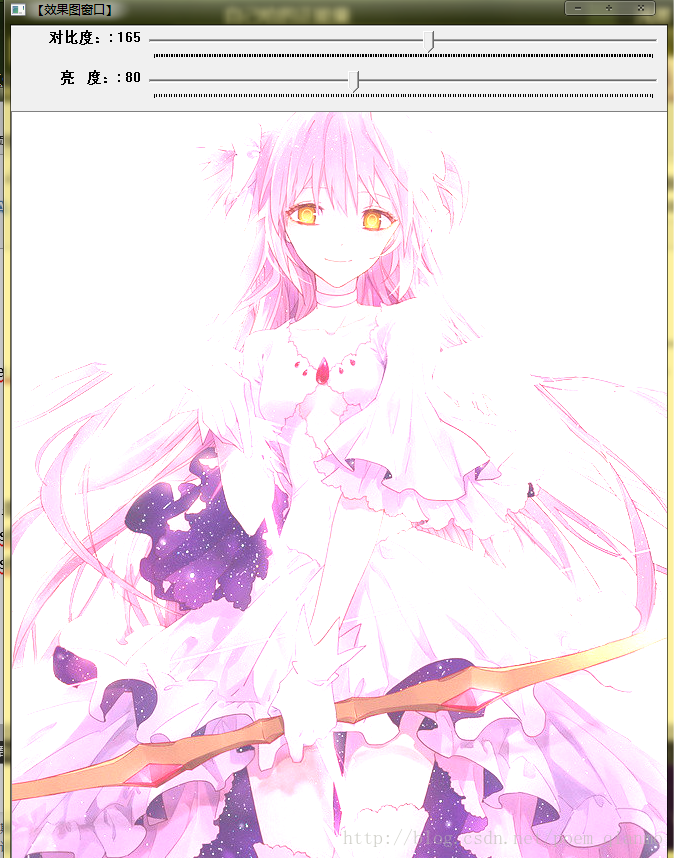 以上就是留胡子飞鸟最近收集整理的关于createTrackbar函数创建和使用轨迹条,以及图像对比度、亮度值的动态调整一、OpenCV中轨迹条(Trackbar)的创建和使用二、亮度和对比度调整的理论依据三、关于访问图片中的像素四、图像对比度、亮度值调整示例程序一、OpenCV中轨迹条(Trackbar)的创建和使用二、亮度和对比度调整的理论依据三、关于访问图片中的像素四、图像对比度、亮度值调整示例程序的全部内容,更多相关createTrackbar函数创建和使用轨迹条,以及图像对比度、亮度值内容请搜索靠谱客的其他文章。