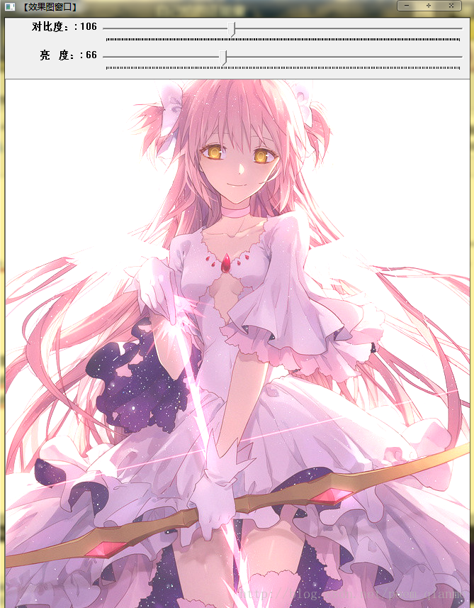 这个示例程序用两个轨迹条分别控制对比度和亮度值,有一定的可玩性。废话不多说,上代码吧: