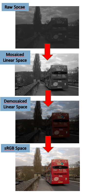 当光线通过 Bayer型 CFA(Color Filter Arrays) 阵列之后, 单色光线打在传感器上, 每个像素都为单色光, 从而理想的Bayer 图是一个较为昏暗的马赛克图。