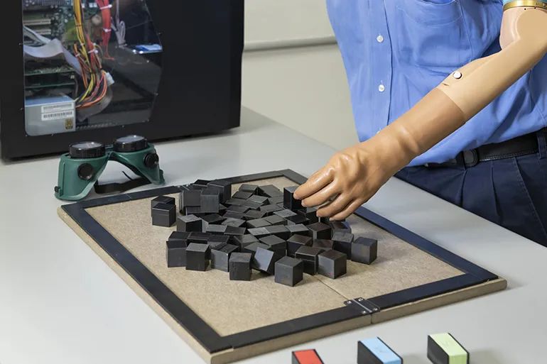 研究人员开发的假肢效率和PEP测试。这个测试提供了关于个体在使用他们的触觉和抓握动觉在干扰物中寻找不同刚度块时所做决定类型的观察。