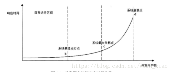 如上图所示纵坐标表示系统的吞吐量,随着并发数据的不断增加,刚开始的时候就像在a~b这个区间里,系统的吞吐量会不断的增大,在b点的时候增大到我们设计的逾期目标,此时我们已经完成了性能测试。这个时候随着并发数量的继续增大,系统的吞吐量的增长逐渐放缓慢,直到达到如上图所示的c点最大值点,这是系统的最大负载点,也成为负载测试点。再次随着并发数量的不断增大系统的吞吐量不增返回下降了,直到达到资源的崩溃点d点,此时称为压力测试点。