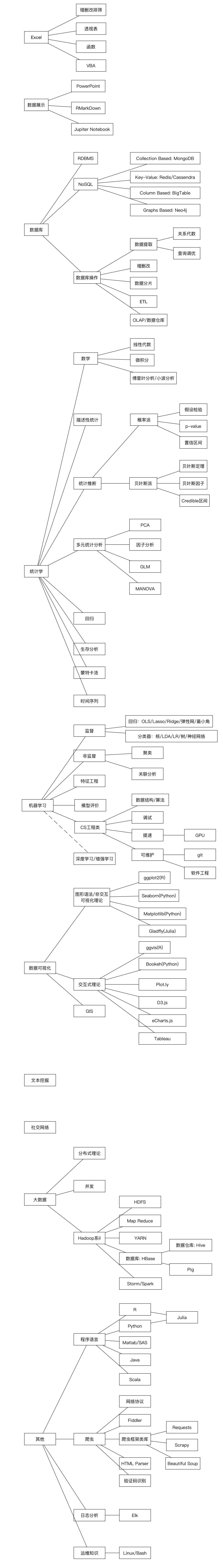 数据工程师(一部分和数据挖掘工程师重合):机器学习精通级别(往往是几种,不用担心不是全部,和数据分析师侧重点不同,更需要了解组合模型,理论基础),会组合模型形成数据产品;计算机基本知识(包括linux知识、软件工程等);各类数据库(RDBMS、NoSQL(4大类))