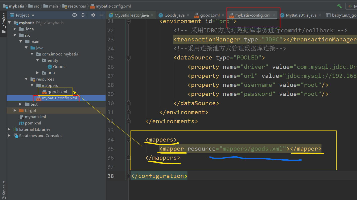 5.新增:为了让mybatis认识这个goods.xml,需要在mybatis-config.xml中对其进行声明