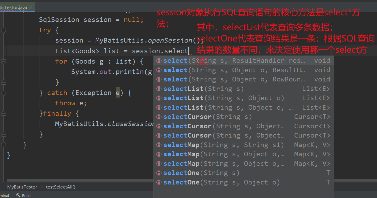 (6)所有的配置工作完成后,在SQLSession对象中调用select方法,执行SQL语句;