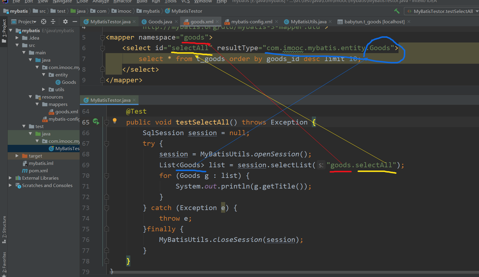<select id="selectAll" resultType="com.imooc.mybatis.entity.Goods">