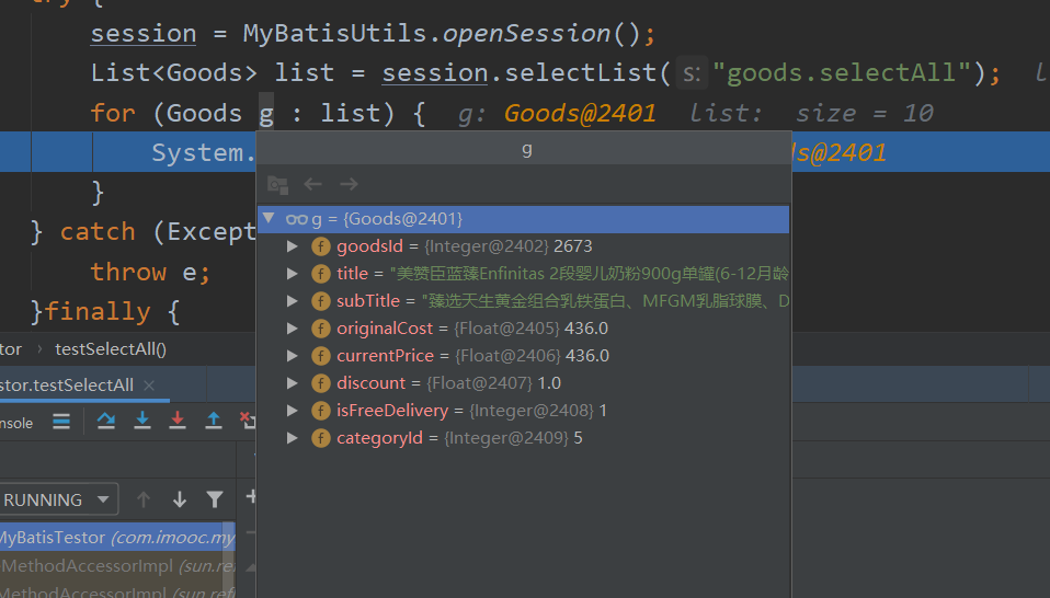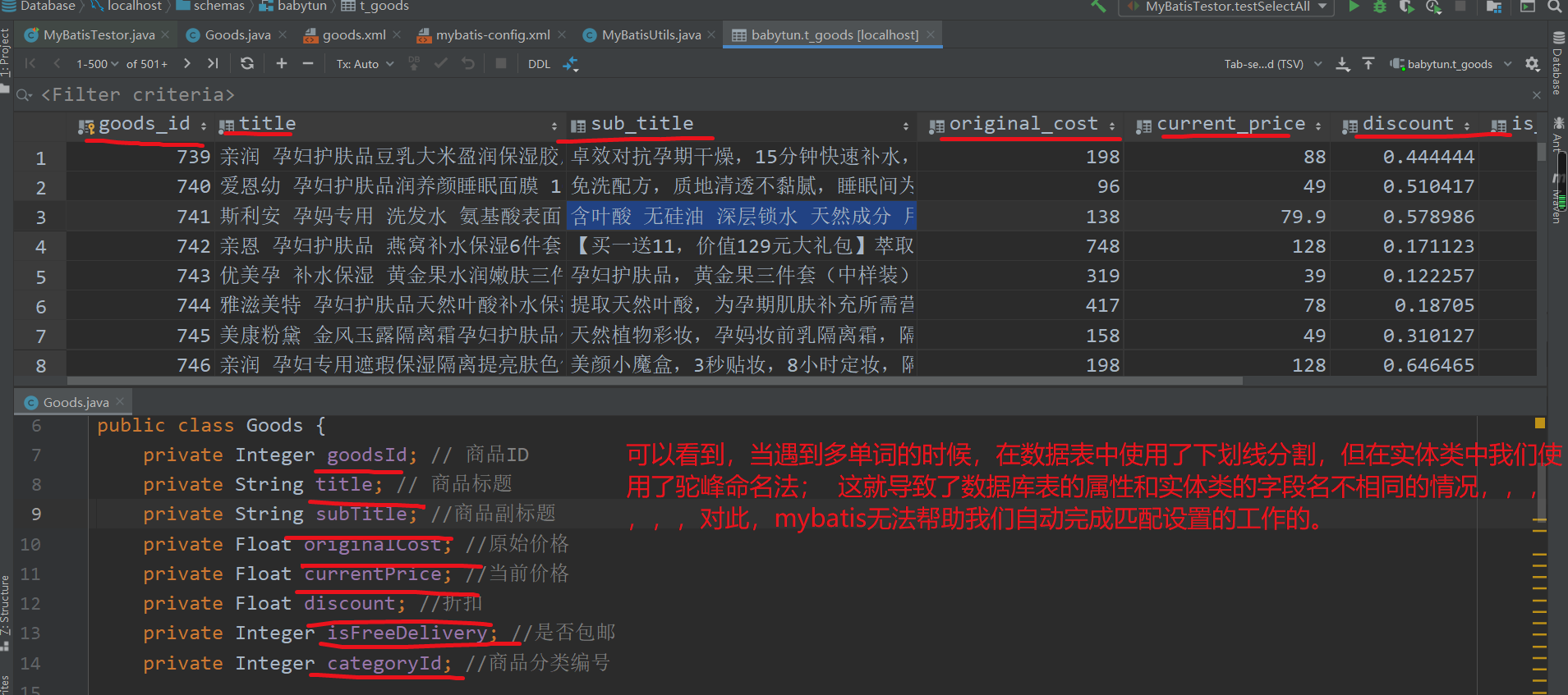 PS:在mybatis中,并没有直接指明说,Goods类就和t_goods表对应;;;;;只是可以用Goods类对象去承载t_goods表的查询结果而已。。。即如上所所示,查询结果的可以使用Goods类对象去承载。其背后的支撑是:对于查询结果的字段,在Goods类的对象中都有对应的属性与其对应。