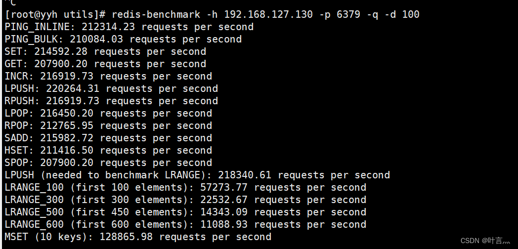 redis-benchmark -h 192.168.127.130 -p 6379 -q -d 100