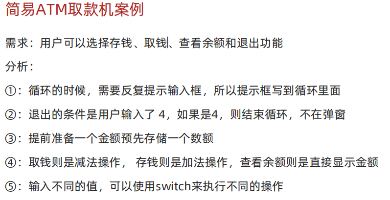// 2. 需要获取到 用户输入的数据 1 - 存款 2 - 取款 3- 查看余额 4- 退出 等值 建议用 switch-case