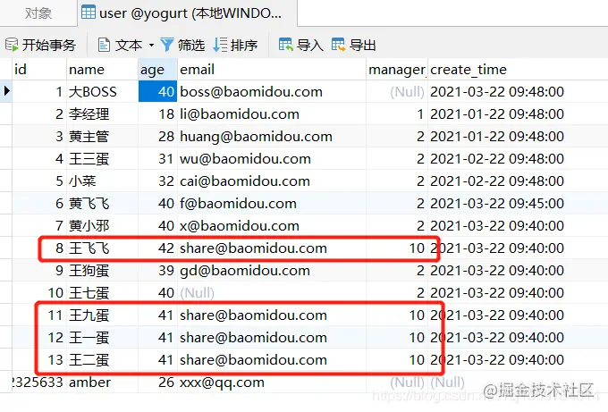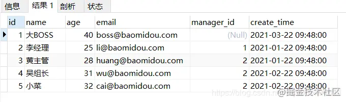 DROP TABLE IF EXISTS user; CREATE TABLE user ( id BIGINT(20) PRIMARY KEY NOT NULL COMMENT '主键', name VARCHAR(30) DEFAULT NULL COMMENT '姓名', age INT(11) DEFAULT NULL COMMENT '年龄', email VARCHAR(50) DEFAULT NULL COMMENT '邮箱', manager_id BIGINT(20) DEFAULT NULL COMMENT '直属上级id', create_time DATETIME DEFAULT NULL COMMENT '创建时间', CONSTRAINT manager_fk FOREIGN KEY(manager_id) REFERENCES user (id) ) ENGINE=INNODB CHARSET=UTF8; INSERT INTO user (id, name, age ,email, manager_id, create_time) VALUES (1, '大BOSS', 40, 'boss@baomidou.com', NULL, '2021-03-22 09:48:00'), (2, '李经理', 40, 'boss@baomidou.com', 1, '2021-01-22 09:48:00'), (3, '黄主管', 40, 'boss@baomidou.com', 2, '2021-01-22 09:48:00'), (4, '吴组长', 40, 'boss@baomidou.com', 2, '2021-02-22 09:48:00'), (5, '小菜', 40, 'boss@baomidou.com', 2, '2021-02-22 09:48:00') 复制代码 -