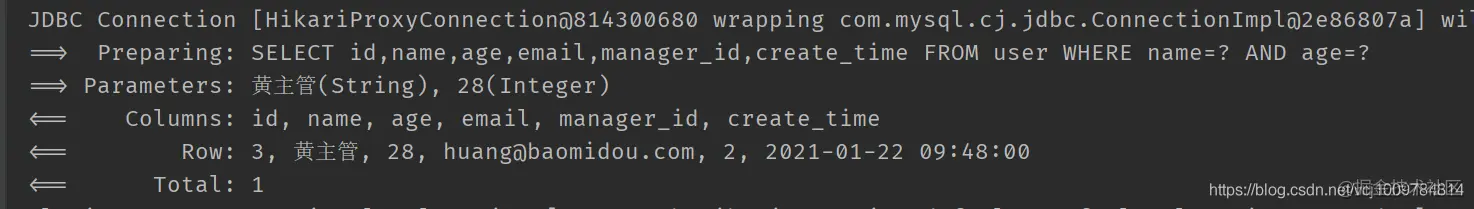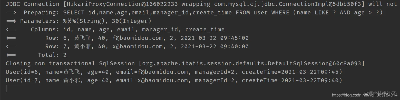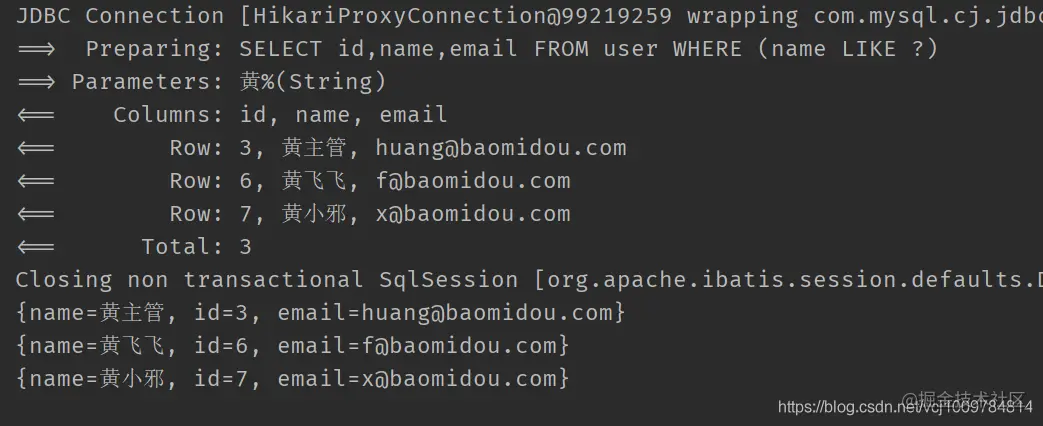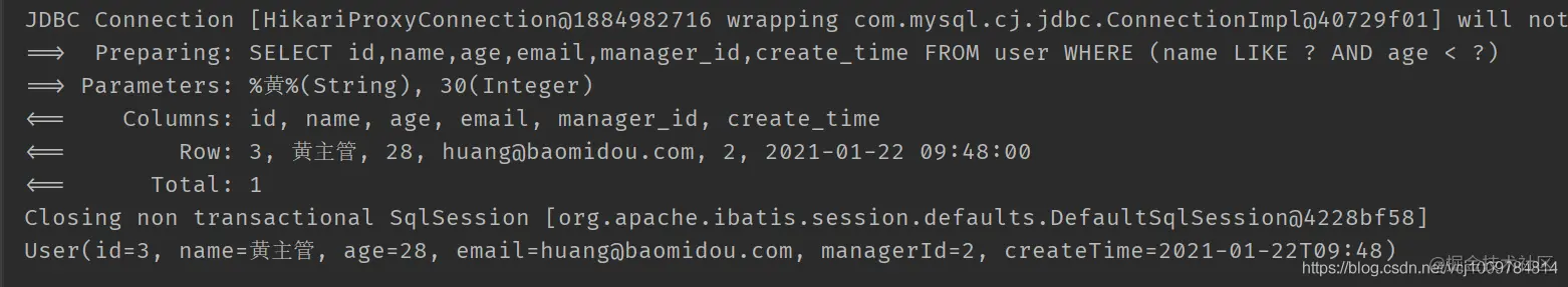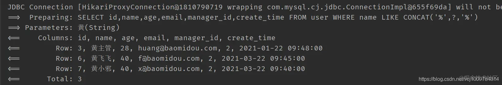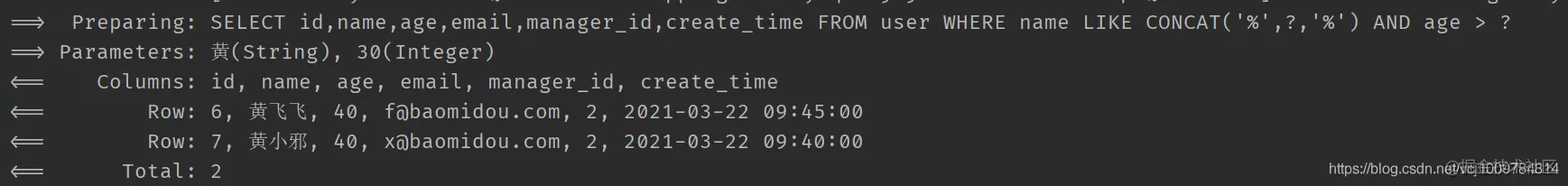 @Test public void test3() { QueryWrapper<User> wrapper = new QueryWrapper<>(); wrapper.select("id","name","email").likeRight("name","黄"); List<Map<String, Object>> maps = userMapper.selectMaps(wrapper); maps.forEach(System.out::println); } 复制代码