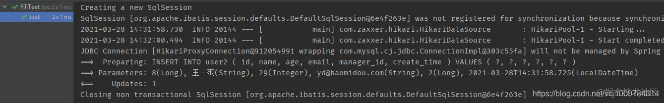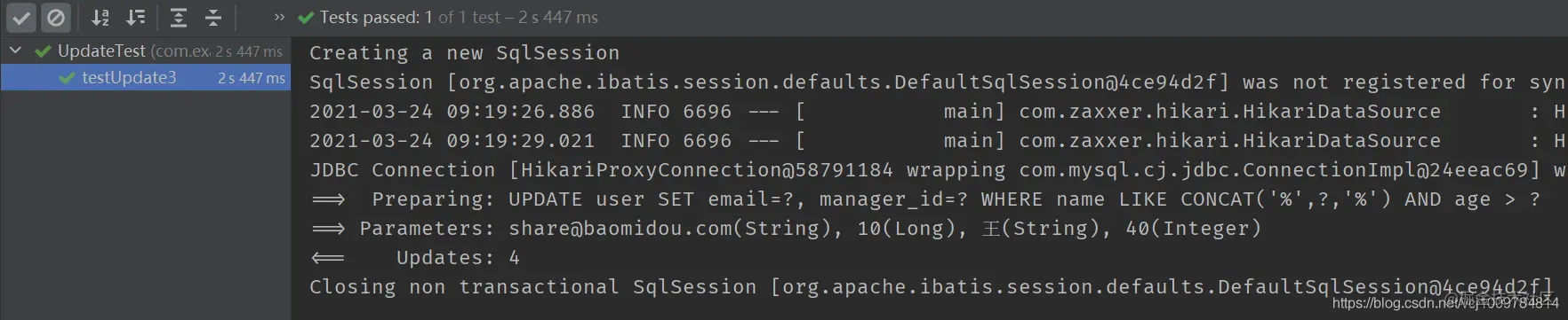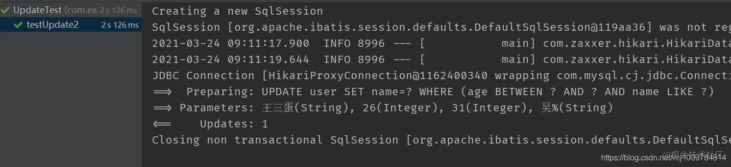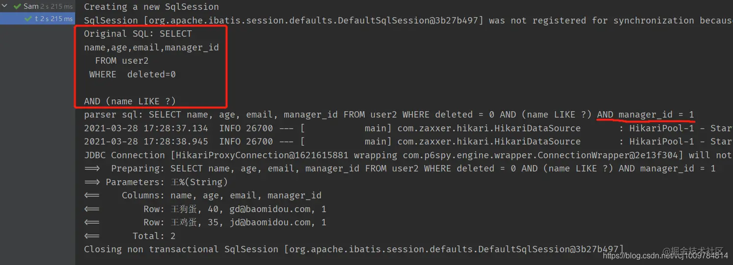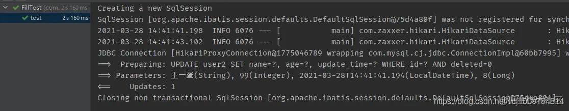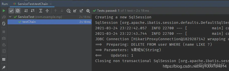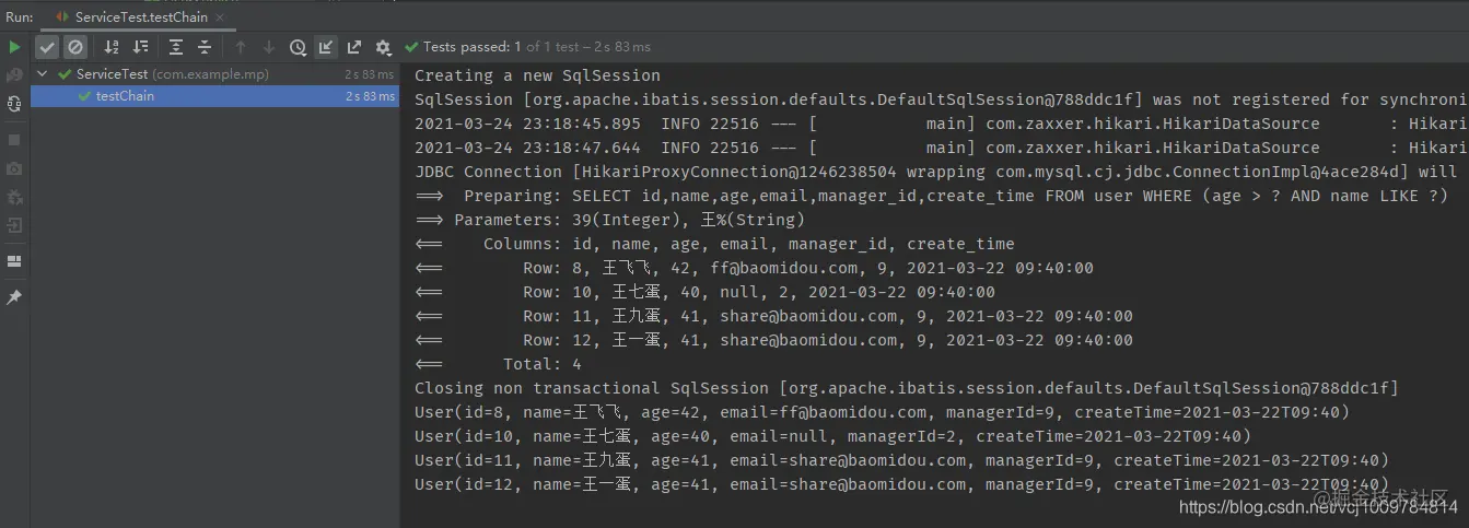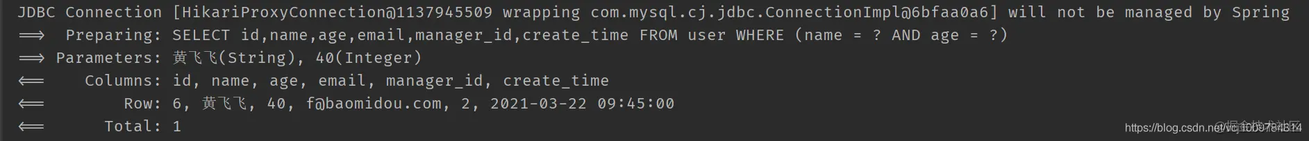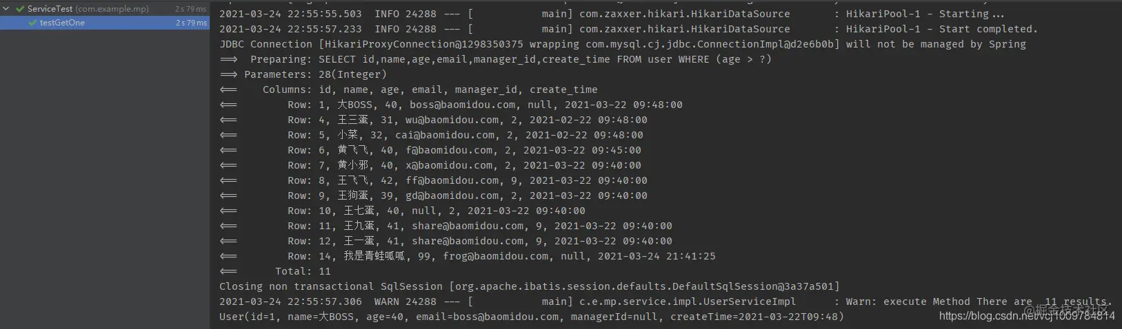 package com.example.mp; import com.baomidou.mybatisplus.core.conditions.query.LambdaQueryWrapper; import com.baomidou.mybatisplus.core.toolkit.Wrappers; import com.example.mp.po.User; import com.example.mp.service.UserService; import org.junit.Test; import org.junit.runner.RunWith; import org.springframework.beans.factory.annotation.Autowired; import org.springframework.boot.test.context.SpringBootTest; import org.springframework.test.context.junit4.SpringRunner; @RunWith(SpringRunner.class) @SpringBootTest public class ServiceTest { @Autowired private UserService userService; @Test public void testGetOne() { LambdaQueryWrapper<User> wrapper = Wrappers.<User>lambdaQuery(); wrapper.gt(User::getAge, 28); User one = userService.getOne(wrapper, false); // 第二参数指定为false,使得在查到了多行记录时,不抛出异常,而返回第一条记录 System.out.println(one); } } 复制代码 -