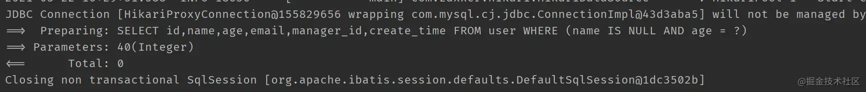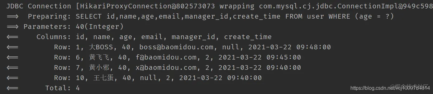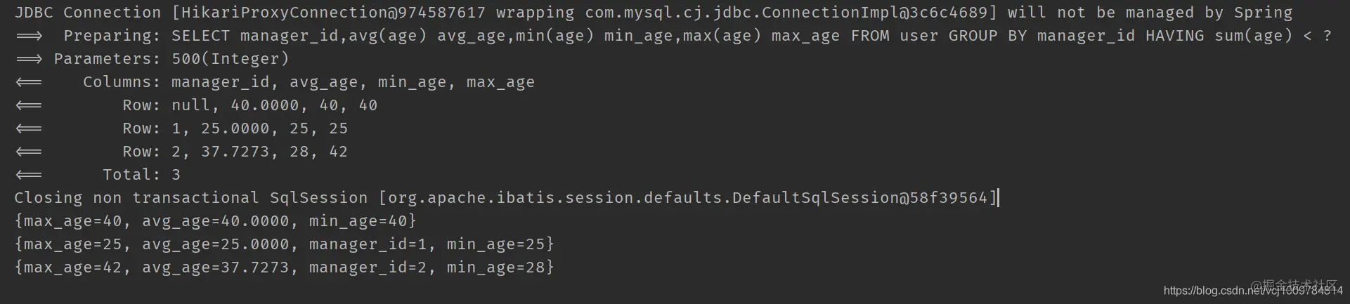 // 按照直属上级进行分组,查询每组的平均年龄,最大年龄,最小年龄 /** select avg(age) avg_age ,min(age) min_age, max(age) max_age from user group by manager_id having sum(age) < 500; **/ @Test public void test3() { QueryWrapper<User> wrapper = new QueryWrapper<>(); wrapper.select("manager_id", "avg(age) avg_age", "min(age) min_age", "max(age) max_age") .groupBy("manager_id").having("sum(age) < {0}", 500); List<Map<String, Object>> maps = userMapper.selectMaps(wrapper); maps.forEach(System.out::println); } 复制代码