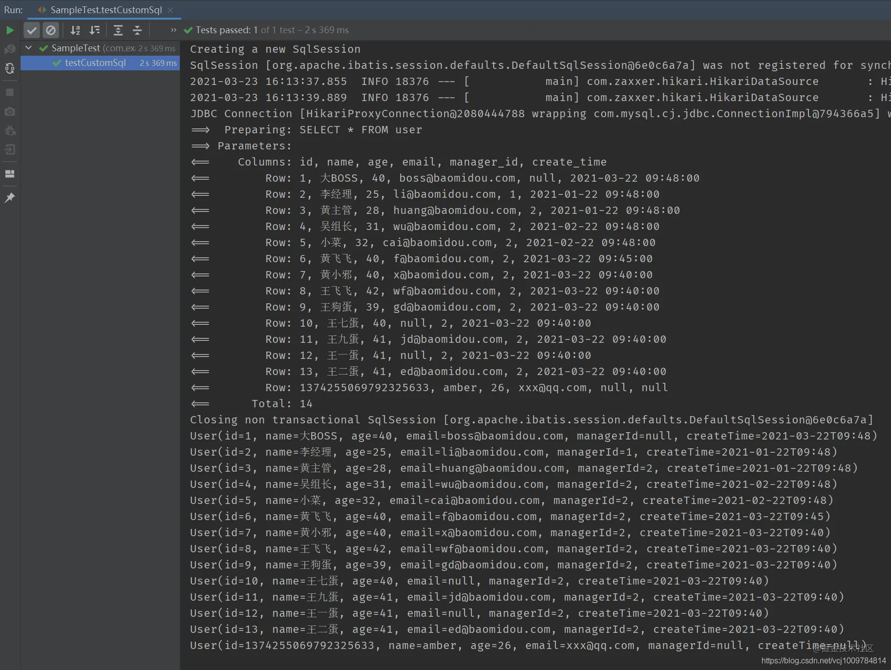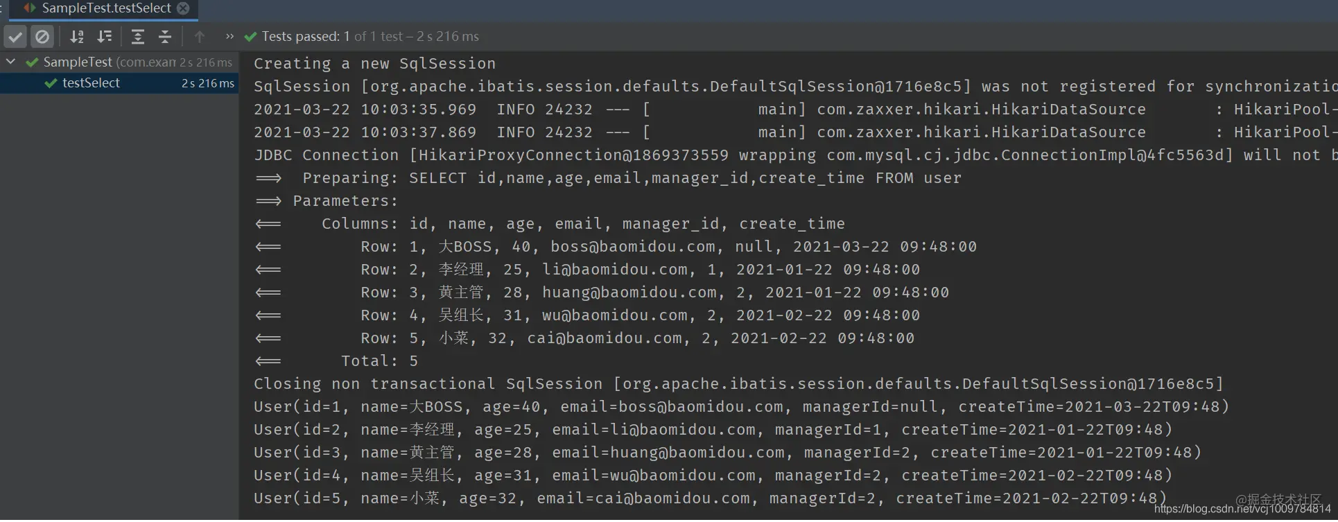 可以看到,针对单表的基本CRUD操作,只需要创建好实体类,并创建一个继承自BaseMapper的接口即可,可谓非常简洁。并且,我们注意到,User类中的managerId,createTime属性,自动和数据库表中的manager_id,create_time对应了起来,这是因为mp自动做了数据库下划线命名,到Java类的驼峰命名之间的转化。