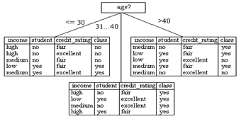 :直觉上age<30的分支,再按哪种属性划分能分得最纯粹?