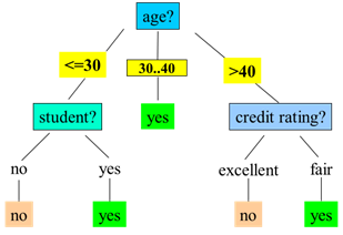 Gini age∈(youth,senior) = (10/14)*(1-(5/10)2-(5/10)2) + (4/14)*(1-(4/4)2-(2/4)2)