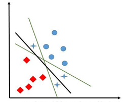 二维(两个属性)情况中,目标是找到一条直线划分出两类;如果是三维那就是找到一个平面,如果是多维,那就是找到一个“超平面”。