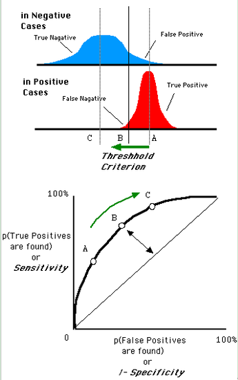还是一开始的那幅图,假设如下就是某个医生的诊断统计图,直线代表阈值。我们遍历所有的阈值,能够在ROC平面上得到如下的ROC曲线。