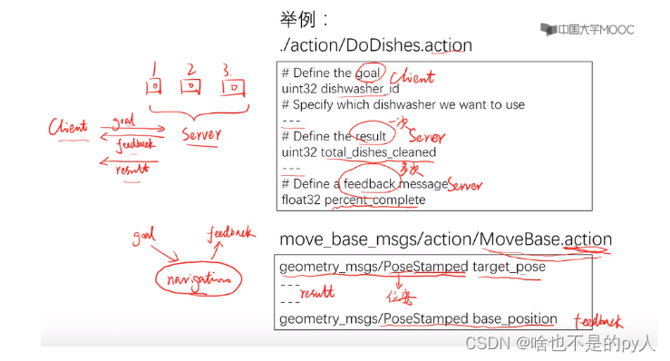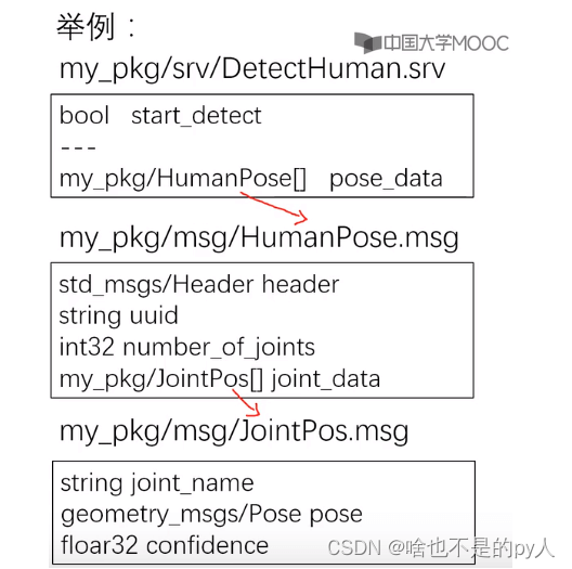 srv:Service通信的数据格式,定义在*.srv文件中。一个示例srv文件如下。