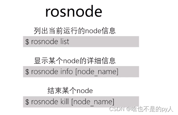 Node:ROS的进程,package里的可执行文件运行的示例,一般以功能划分。启动Node的命令是rosun [pkg_name] [node_name](必须先启动好master);也可以以launch文件的方式启动:roslaunch [pkg_name] [*.launch](自动判断master是否运行,没有的话自动启动),这样可以一次启动多个node。rosnode命令则用于查看和管理node,常用功能如下。