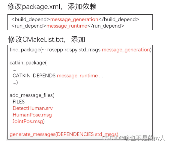 此外在自定义了Topic或Service后,都需要在package.xml和CMakeLists.txt中修改对应内容,如下。