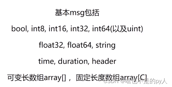 Message:Topic内容的数据类型(格式标准),定义在*.msg文件中。Message可以理解为类,而发布的一条条的信息则是类的对象。基本Message类型如下: