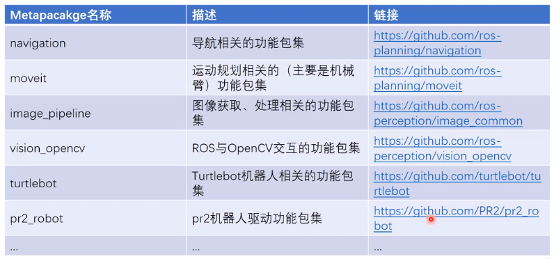 可以翻译为“元包”或“虚包”,其本身没有什么内容,只包含有package必备的CMakeLists.txt和package.xml。但它依赖了其它包(在package.xml中指定),通过这种方式将多个包组合起来。这样做的好处就是在安装的时候就不需要一个个安装,而只安装一个metapackage就可以了。ROS中常见的Metapackage如下: