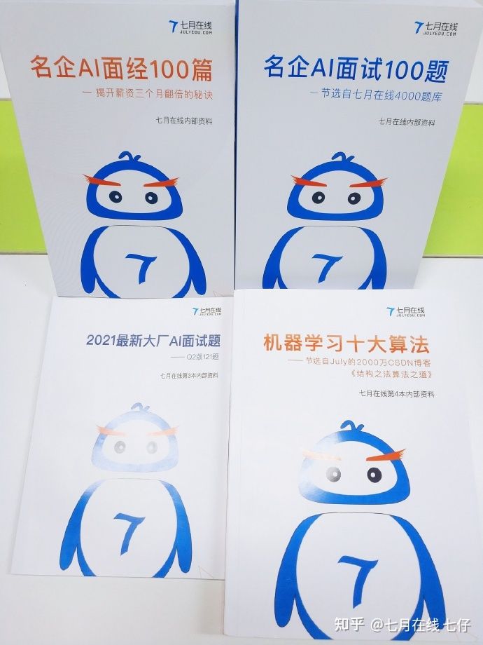 了解七月在线的的小伙伴应该知道2019年七月在线出了两本书《名企AI面试100题》和《名企AI面经100篇》,反响很好,助力数千人拿到dream offer。今年我们又整理出了两本书《2021年最新大厂AI面试题 Q2版》、《机器学习十大算法系列》、《2021年最新大厂AI面试题 Q3版》,七月在线学员拿到书后反响不错。为了让更多AI人受益,七仔现把电子版免费送给大家。
