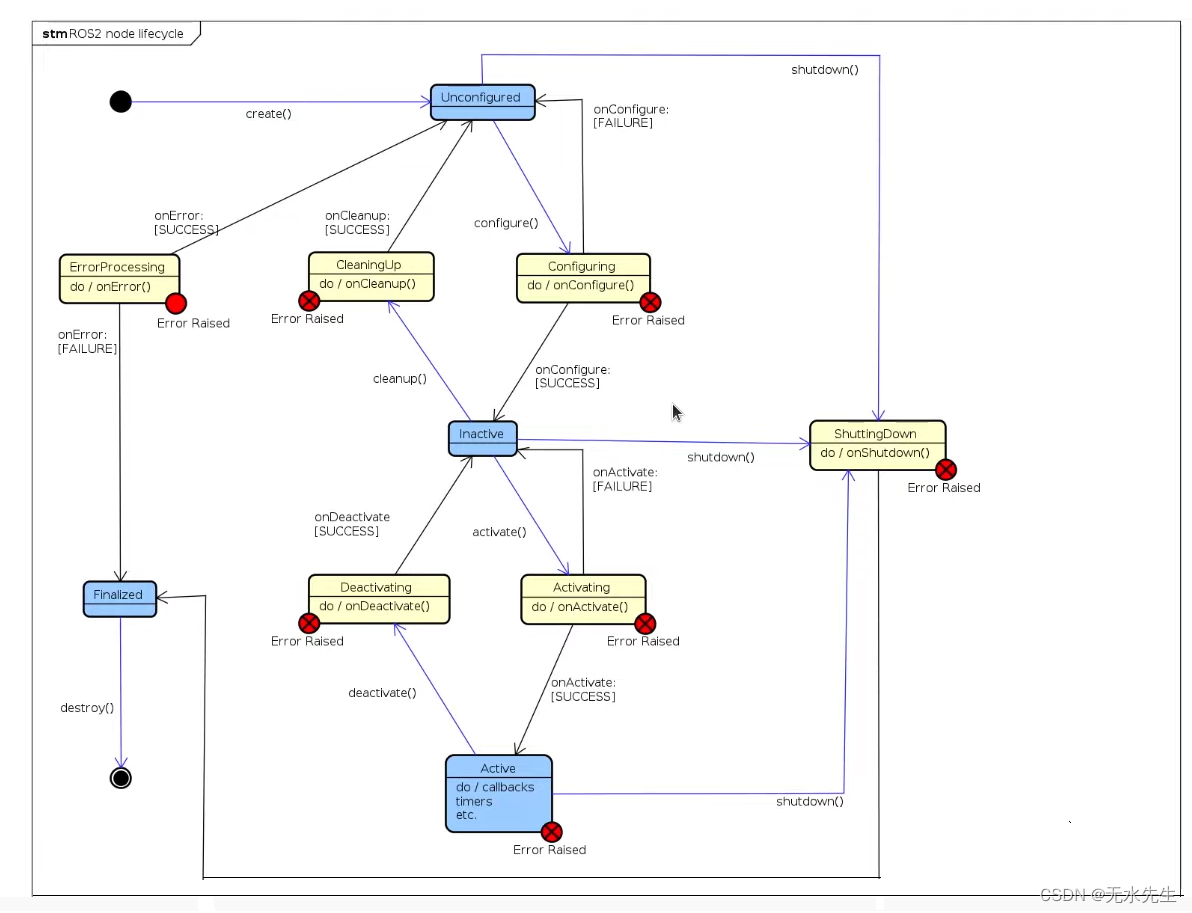 ros2开始有了生命周期的概念,即节点有未配置状态,未激活状态,激活状态,以及冰冻状态;显然,ros2的节点已经是一个多线程管理机制,内部有状态机组织。
