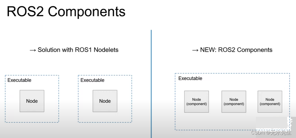 ros1的最小运行单元是节点,从通信上看,ros1是节点机制,即节点之间都可以相互通信,因为每个节点可以与master通信;而ros2的最小运行单元是可执行对象,每个可执行对象内部可以包含若干个组件,组件与组件能实现通信。