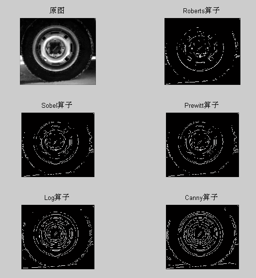 以下分别采用上述几种最常用的经典图像边缘提取算子对标准的tire 图像进行边缘特征提取,其结果如下图所示: