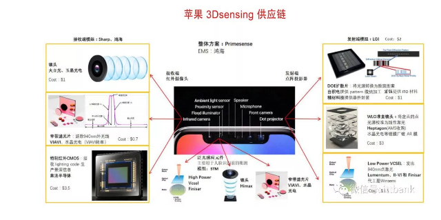 iPhone X 采用的 3D Sensing 核心元件包括点阵投影器(Dot projector)、接近传感器(TOF)和泛光照明(Floodilluminator)等。