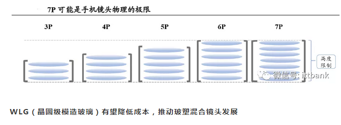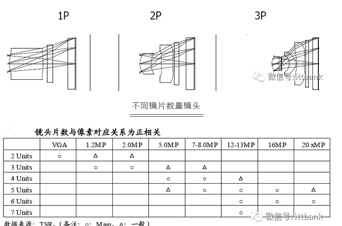 一般而言镜头片数越多,成像效果越好,高像素一般对应更多的镜头片数。在2MP 上3P 是主流,5MP 上4P 是主流,但也有为了实现低价而采用3P。8MP 采用4P 和5P,5P 为主流。12-13MP 采用了5P 和6P,也有对13MP 进行4P 产品化的情况。16-20MP 采用5-6P。