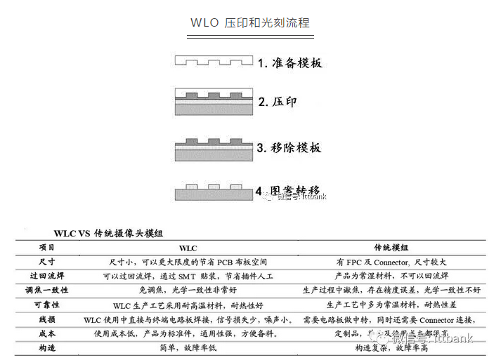 WLO(晶圆级镜头)是指晶元级镜头制造技术和工艺,与传统光学元件的加工技术不同,WLO 工艺在整片玻璃晶元上,用半导体工艺批量复制加工镜头,多个镜头晶元压合在一起,然后切割成单颗镜头,具有尺寸小、高度低、一致性好等特点。
