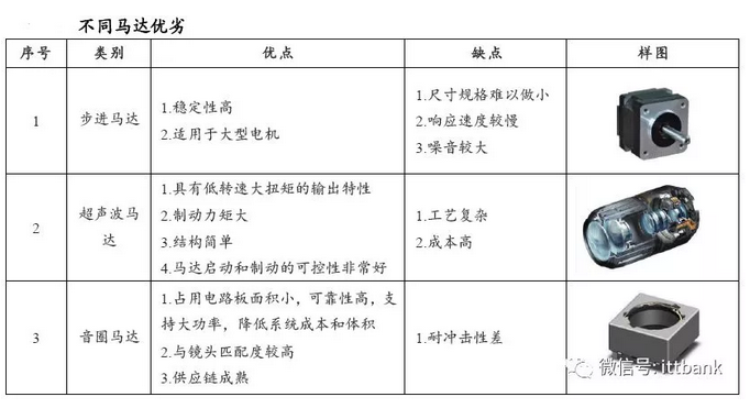 马达在摄像模组中的作用主要是实现AF(自动对焦)与OIS(光学防抖),目前智能手机采用的马达主要分为三种:步进马达、超声波马达和音圈马达。