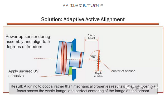 对于这一问题的解决方案称为AA(Active Alignment)主动对准技术,按照光学效果而非机械参数进行装配。拥有AA 制程的设备在组装每一个零配件时,设备将检测被组装的半成品,并根据被组装半成品的实际情况主动对准,然后将下一个零配件组装到位。AA 制程通过调节镜头对准至6 个自由度(X,Y,Z,θX,θY,θZ),即调节相对位置和镜头倾斜,可确保拍照画面中心最清晰,以及提升画质均匀性,产品一致性得到显著提升。