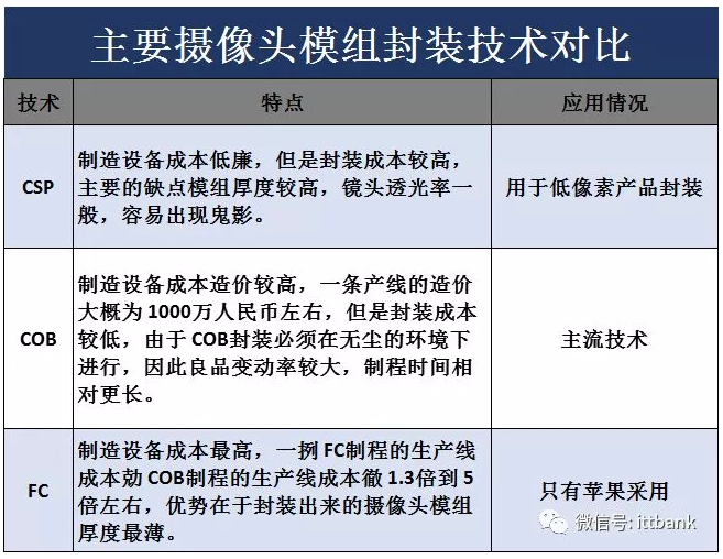 摄像头模组主流的封装技术分为三种,一种为CSP 技术(chip sizepackage),一种为COB 技术(chip on board),以及FC(flip chip)技术。