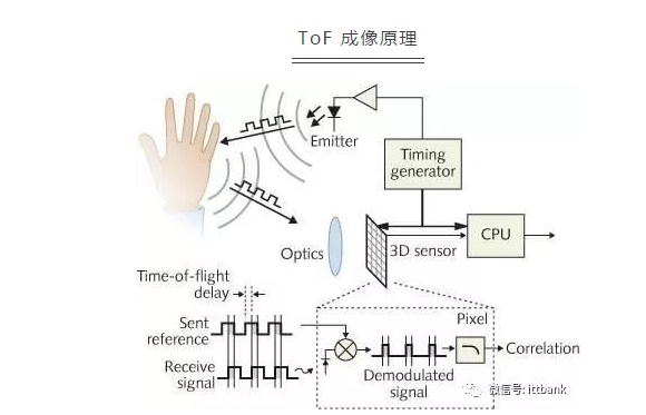 ToF 技术是发射一束经过相位调制的红外激光到被测物体,当红外激光被反射回摄像头,会因为光飞行时间的延迟,导致相位跟发射时的相位有微小的变化,通过计算相位的变化,就可以计算出被测物体到摄像头之间的距离。