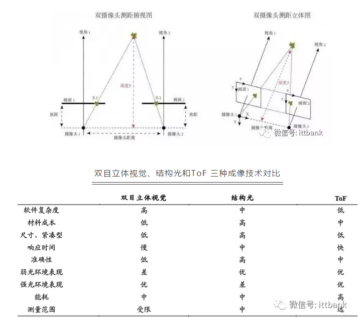 综合而言,双目立体视觉在检测范围,3D 建模时间,弱光环境性能,功耗,算法复杂度等指标上明显弱于结构光和ToF,存在明显缺陷,因此我们判断未来该技术在手机3D 成像领域前景暗淡。结构光与ToF 各有优劣,都具备商用推广的基础。