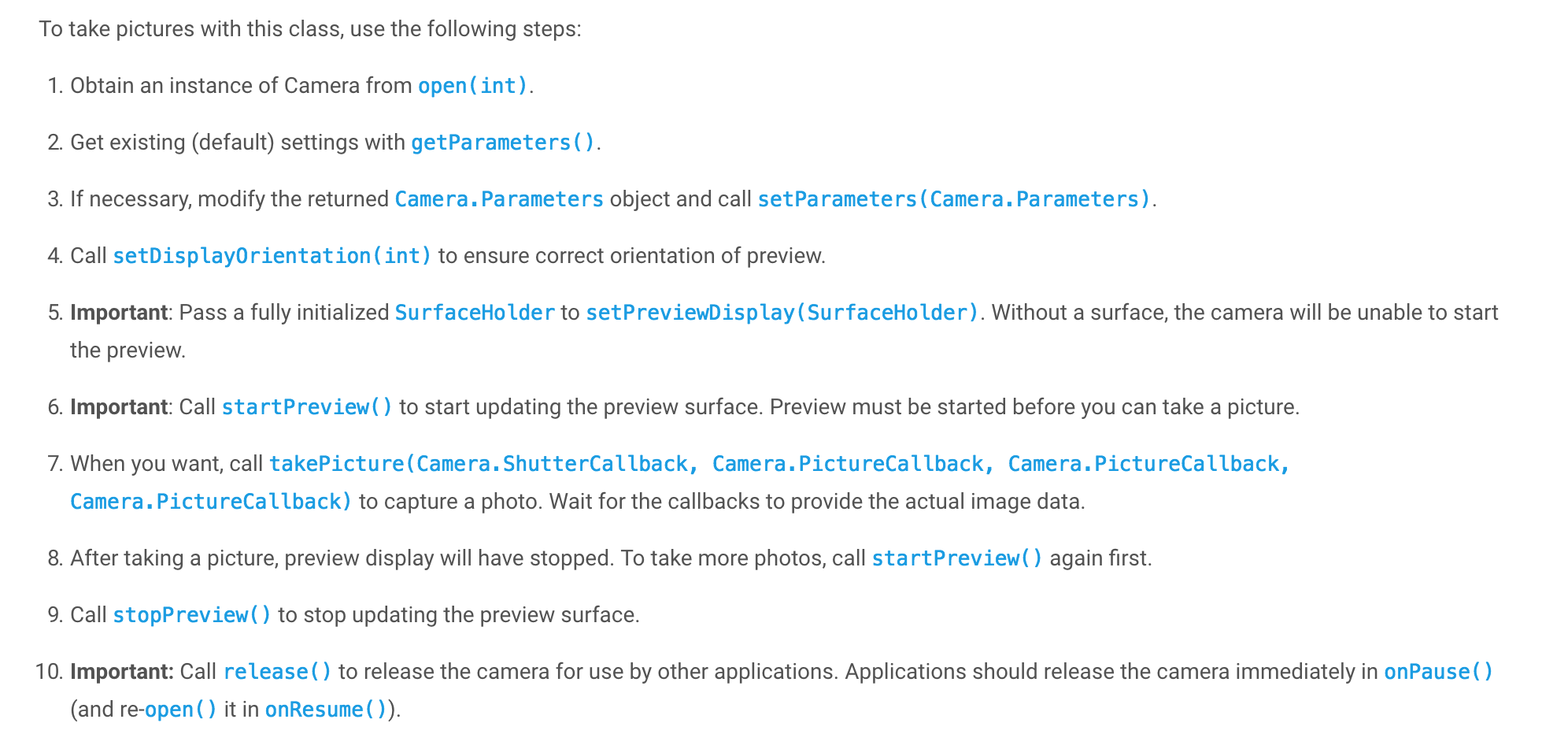 关于旧版的Camera类,google官方给了下面的指导步骤,https://developer.android.com/reference/android/hardware/Camera.html