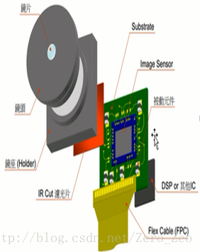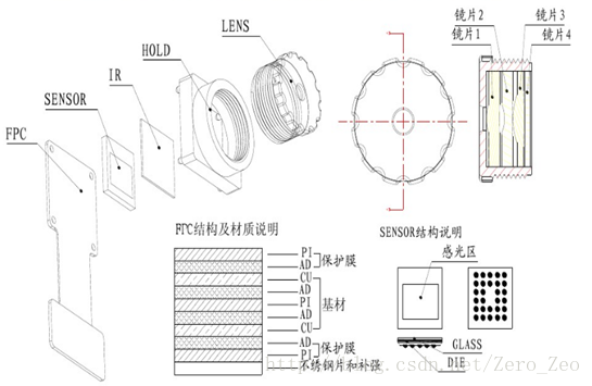 首先我们还是以手机摄像头为例,先拿一张手机camera模组的结构图(如果你身边有这样一颗模组的话,你自己最好拆一颗看看内部的构造,然后这样更容易理解):