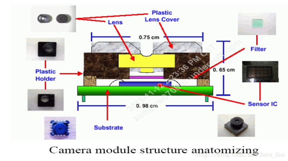 在成像原理图中我们看到了从光线进入到JPG图片形成,经过镜头,光圈,传感器等等元器件,最后经过ISP处理形成了一张漂亮的图片,而这些小元器件组装在一起我们就称作为camera模组。