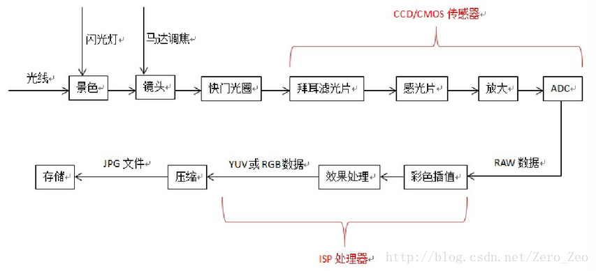 一个手机,我们从app中打开camera,然后就看到camera的拍摄的景色,然后按下开关就会形成一个静态的照片,那么这张照片是怎样形成的呢?他的整个过程又是怎样的?如成像原理如下图: