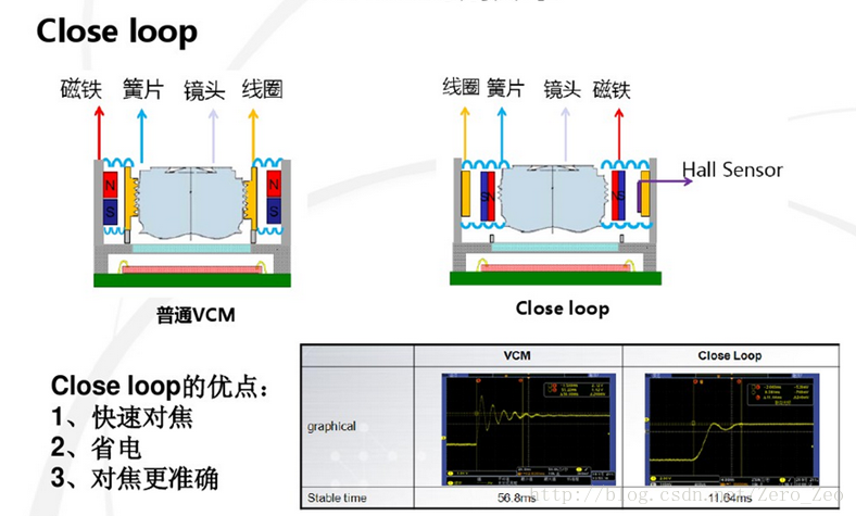 普遍手机用的都是这种VCM的电机控制镜头移动,而这种马达又随着技术的进步分为了open,close loop,中置马达。关于open和close loop的不同: