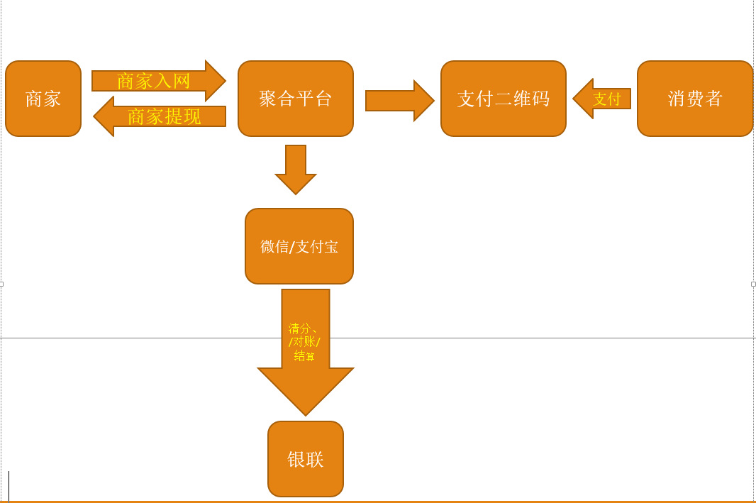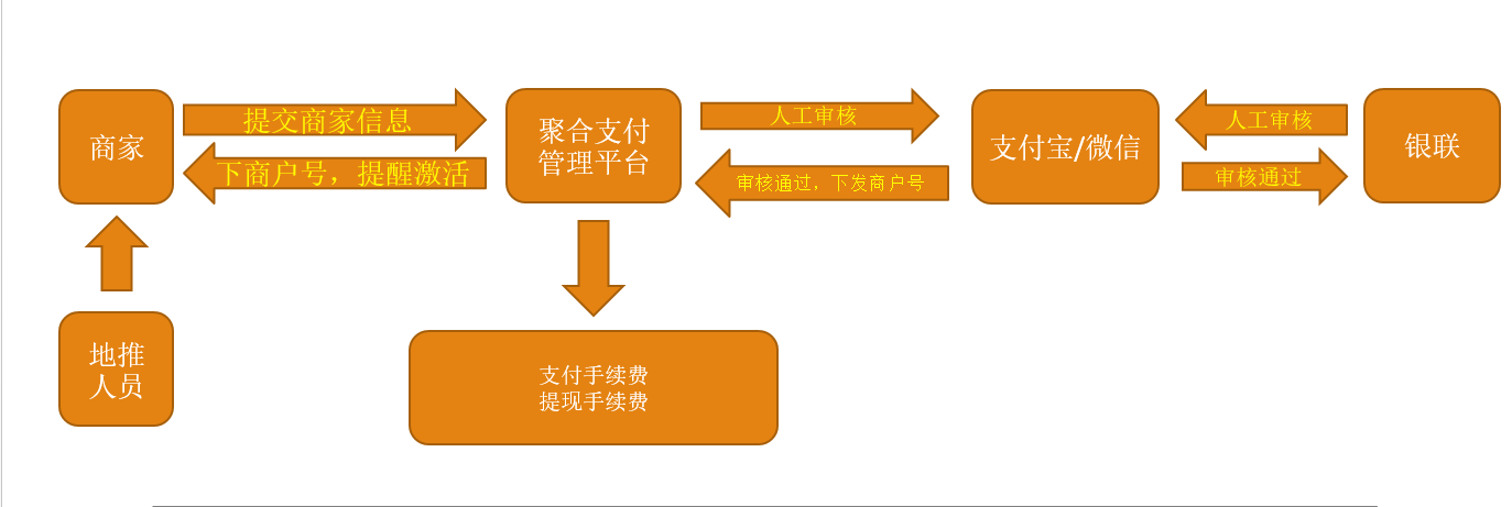 商户落网--对商户进行配置(支付方式、支付渠道)--商户激活收款码--发起支付--清分--对账--结算