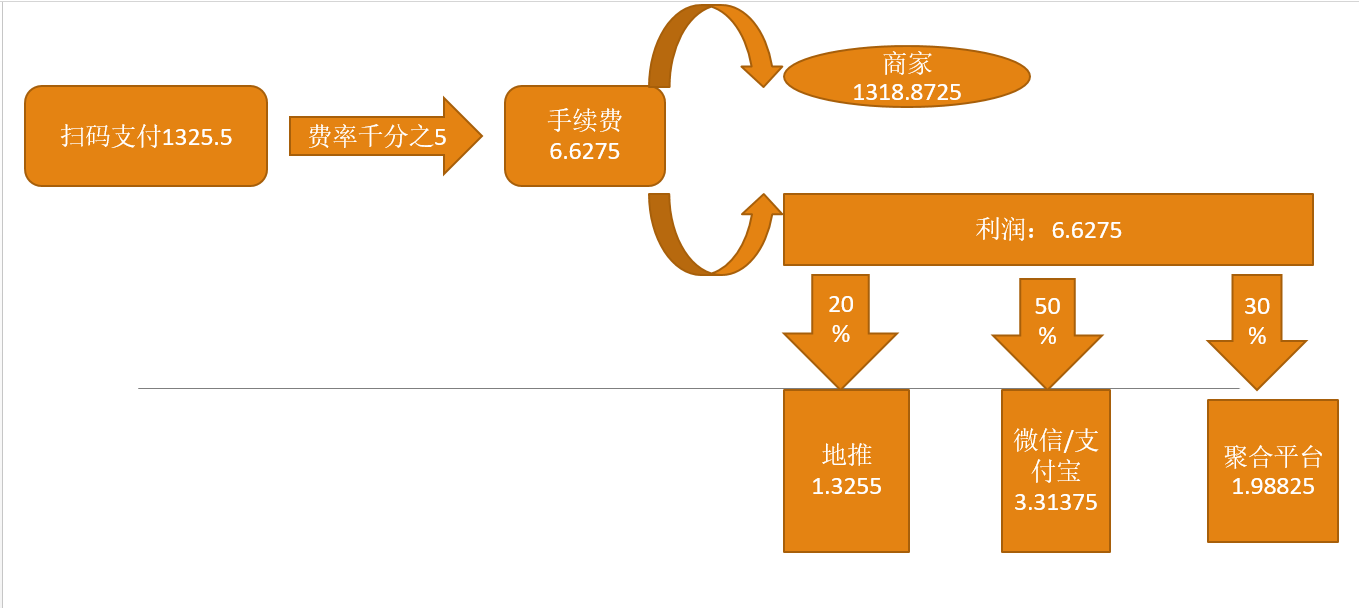 3、兜底算法(目前行业的金额算法,一般是大头兜底,比如上图的地推、支付宝/微信、聚合平台当中一般就是支付宝/微信兜底[支付宝/微信=利润-地推-聚合平台支付金额])但是退款就有平台来兜底