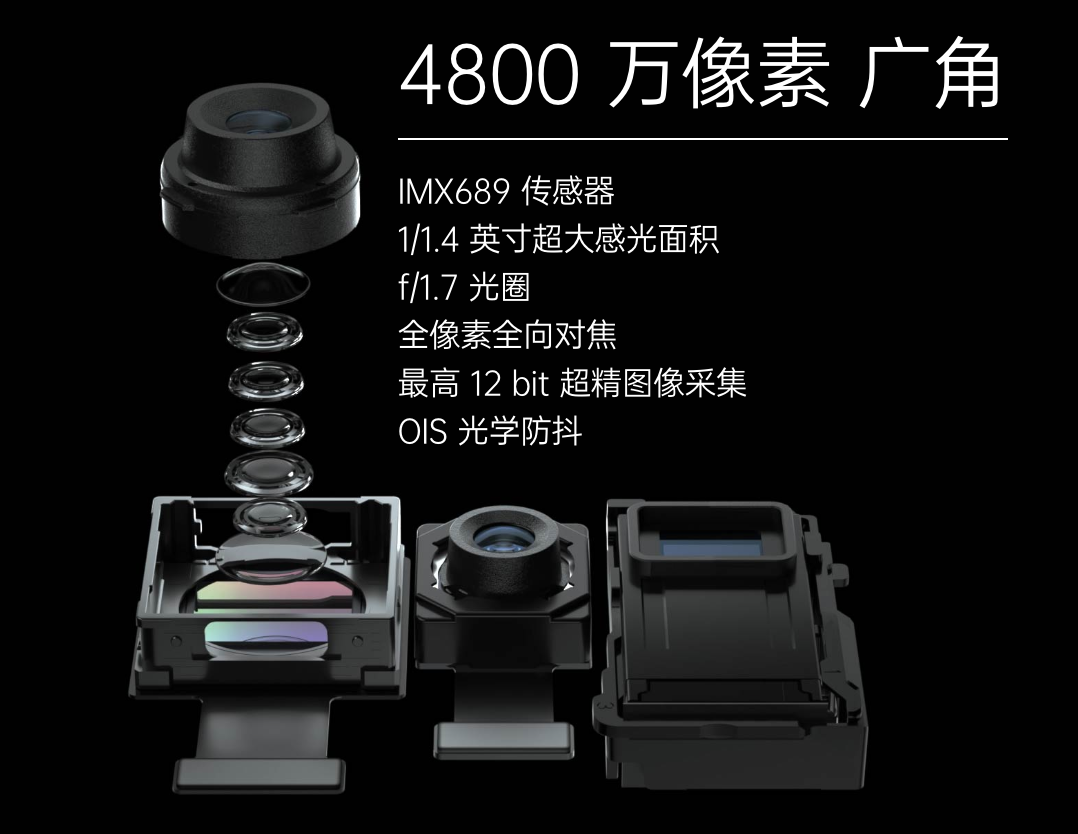 4800万超广角镜头拥有索尼IMX586 传感器,1/2英寸感光面积,f/2.2 光圈,6P 镜头,120° 超广视角,3cm 超级微距,4.3倍取景范围。