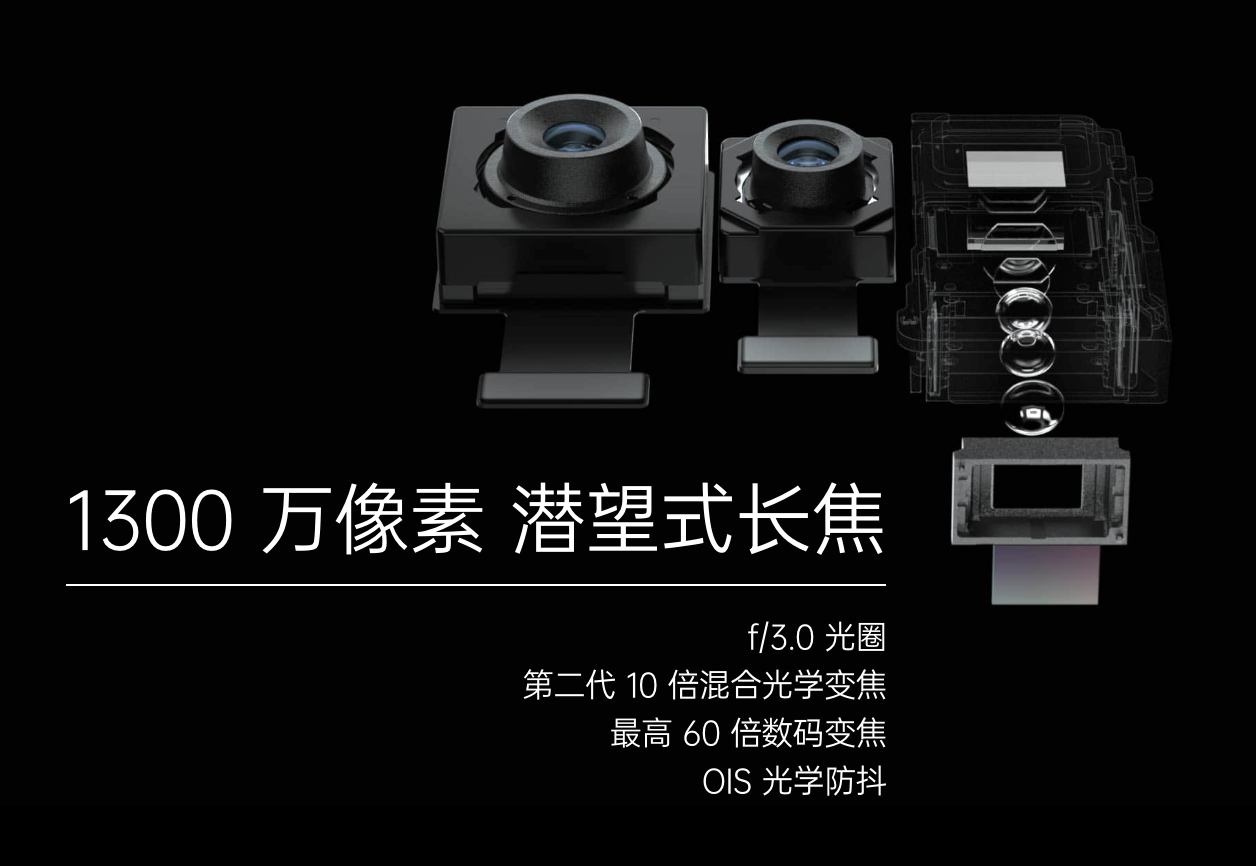 1300 万像素潜望式长焦摄像头,f/3.0 光圈,5P 镜头,第二代 10 倍混合光学变焦,最高 60 倍数码变焦,OIS光学防抖。
